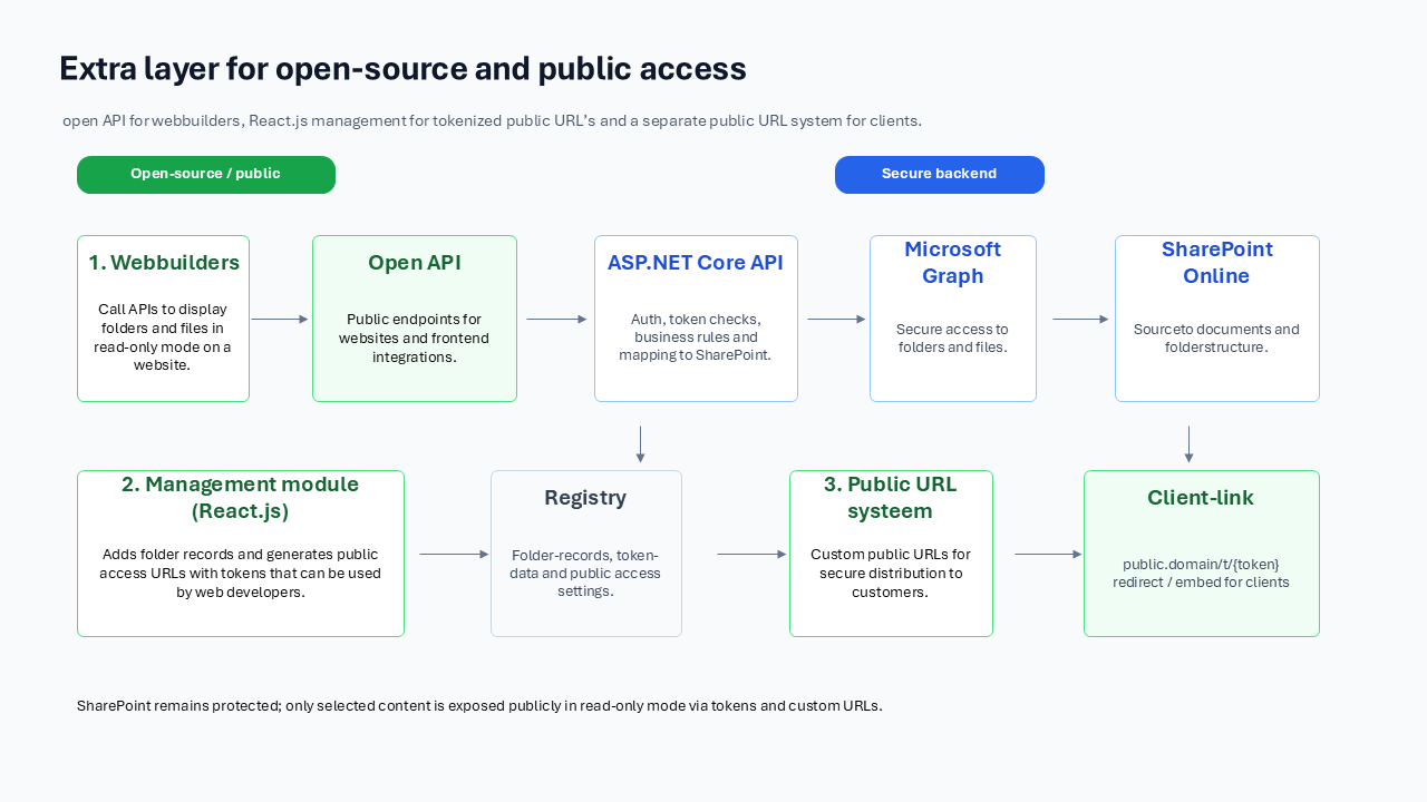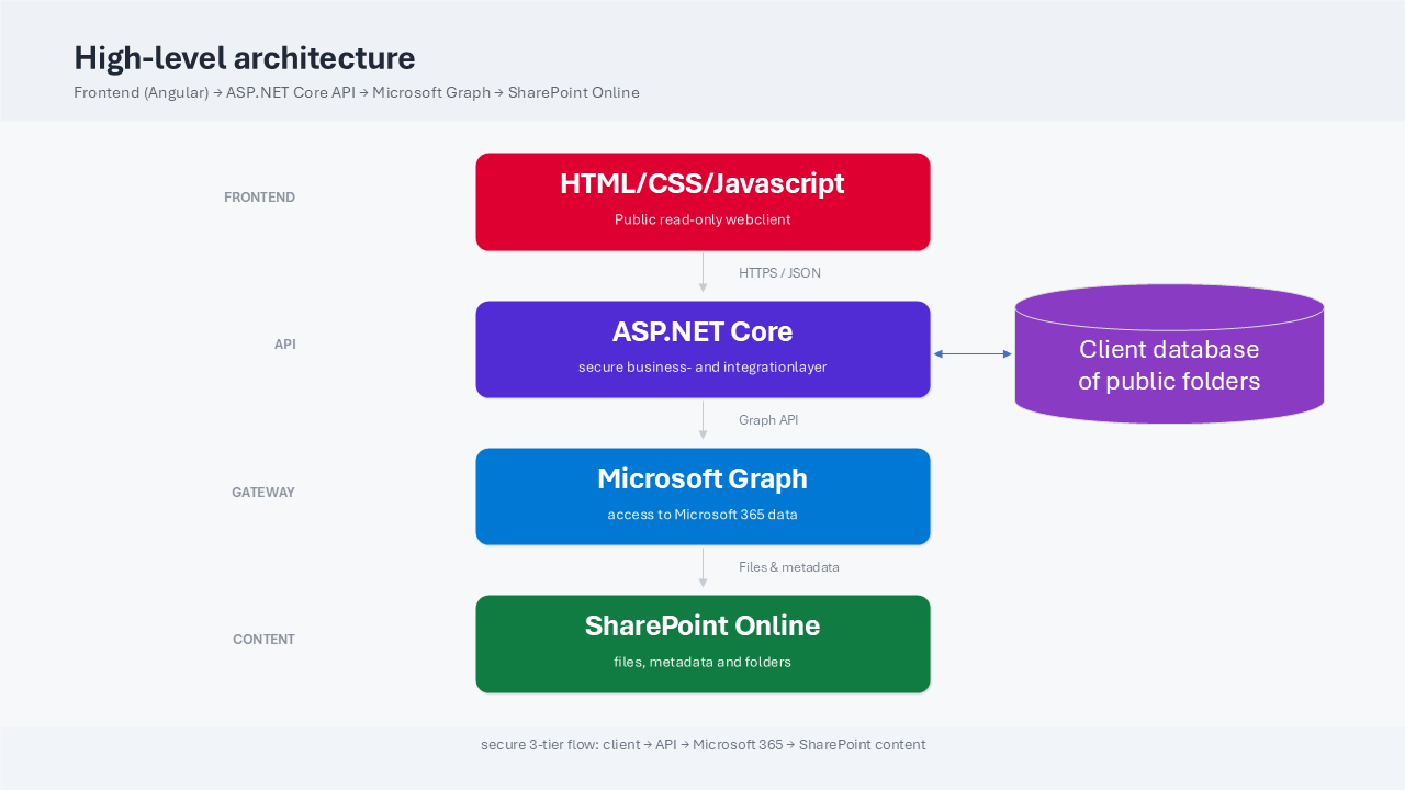 This solution connects SharePoint Online with a modern web application via Microsoft Graph and an ASP.NET Core API. This enables documents to be delivered securely, in a structured way, and user-friendly within a custom application or portal.